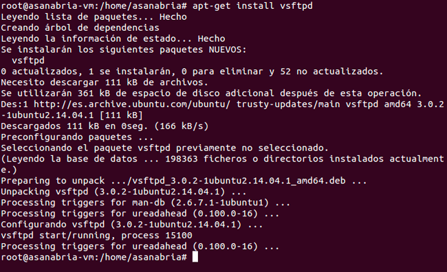 Lo primero es hacer “apt-get update” par actualizar los repositorios, y lo siguiente “apt-get install vsftpd” para instalar el servidor ftp. Recordad siempre añadir delante sudo para ser root y no tener problemas de permisos en el proceso.